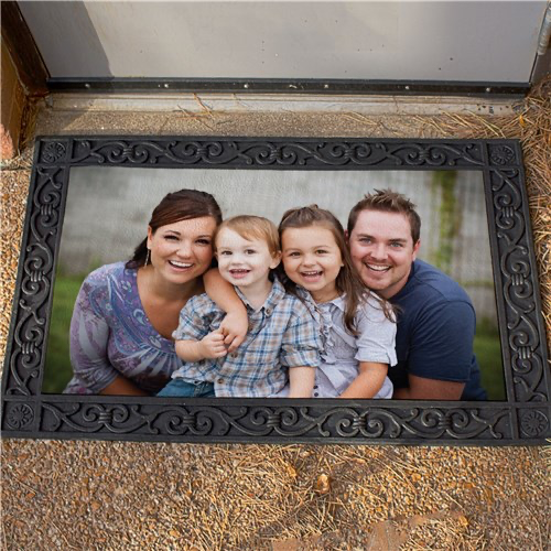 Personalized Black and White Plaid with watercolor foliage and dogs Doormat